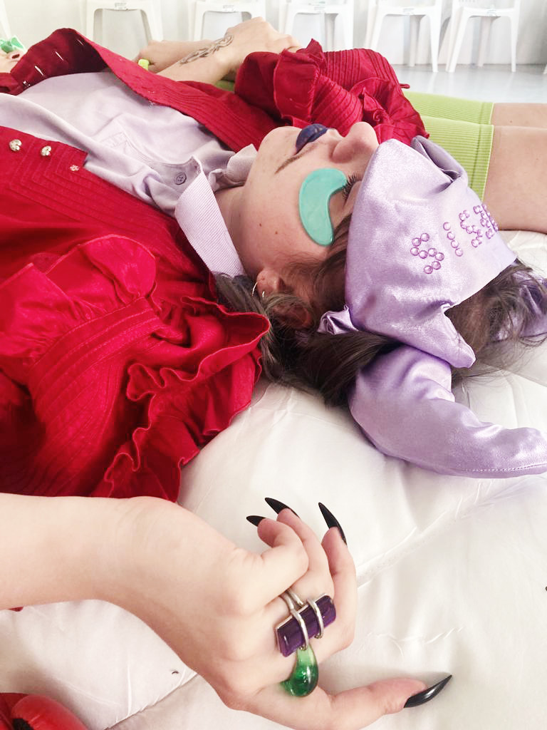 They sleep, apply face masks, tend to their nails, and rest beneath silk eye-pads. These private rituals unfold in public, offering a tender counter-image to the spectacle of villainy. By juxtaposing the trope of the villain with acts of care, the work challenges the ways in which society flattens complex characters—particularly those coded as queer, feminine, or other—into symbols of threat or deviance. Through this lens, self-care becomes both a coping mechanism and a fragile form of resistance. At the same time, the piece questions the limits of individual wellness practices within larger systems of harm. It invites viewers to consider what happens when care is no longer framed as personal healing, but as collective necessity. In this slowed-down world, even the most feared figures are allowed to rest.